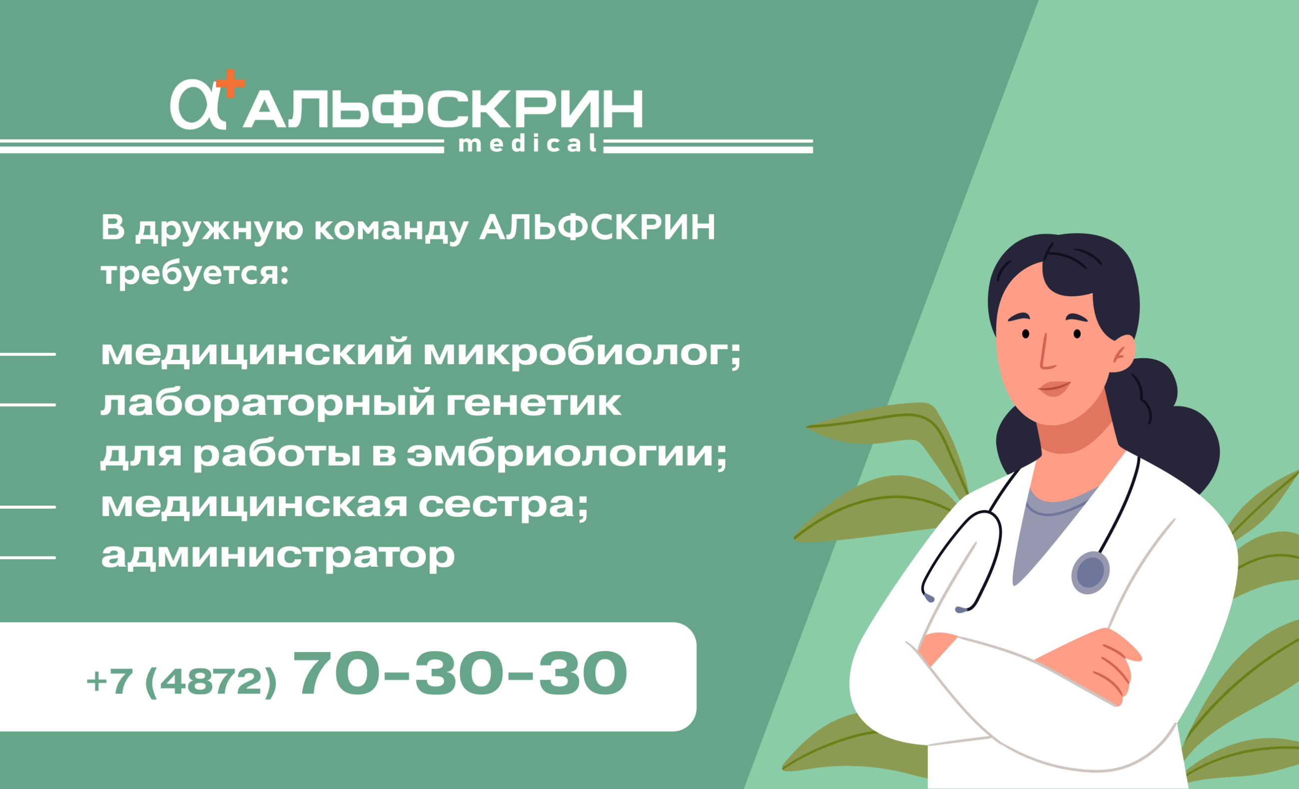 по адресу г. Тула ул. Гоголевская 51 А требуется медицинский микробиолог, лабораторный генетик для работы в эмбриологии;